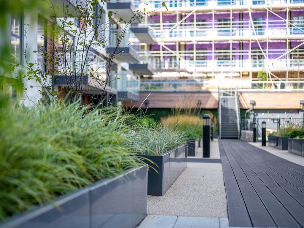 Natural Dimensions has collaborated with Jefferson Sheard Architects to design and deliver these stunning roof gardens for a key landmark apartment building and podium green space in Hayes, West London. Built on the site of a former vinyl factory, central to the building’s three interlinked blocks are the three landscaped podiums on the 9th, 2nd and 1st storeys. They provide spectacular multi-level green social spaces and gardens over nearly 0.2ha making it one of the largest green roofs and pocket roof parks in London.