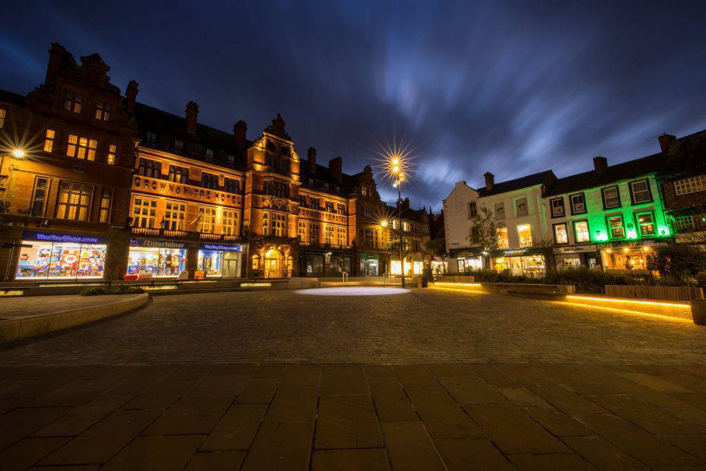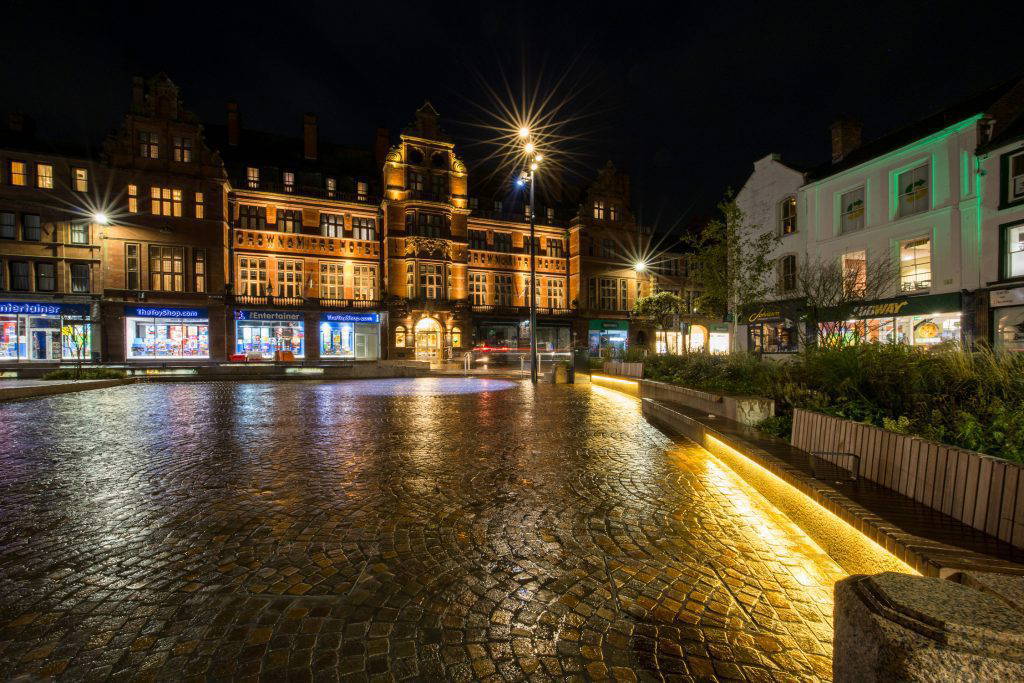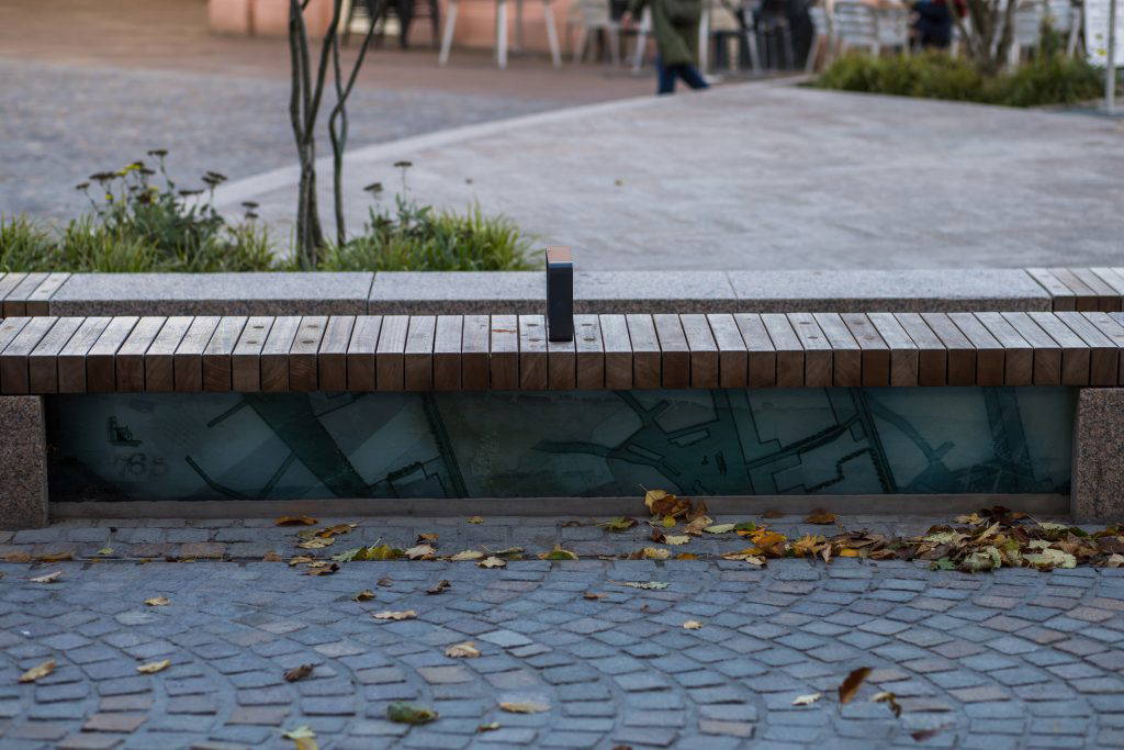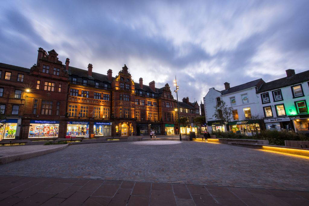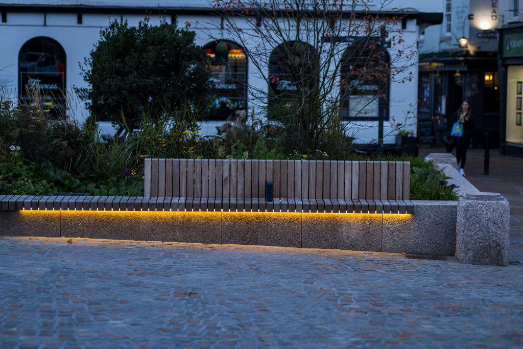 The western seat wall along the front of the Crown and Mitre hotel, incorporates an array of backlit glass panels designed by Natural Dimensions to exhibit images of the Greenmarket from previous centuries. ‘ To Market’, a collage of historic maps and photographs, artistically reinterpreted and arranged by Kirsty Brooks, was etched into the ten glass panels to tell the story of historic market trading, the guilds, weights, measures and the evolution of the site. The area is a gateway into the city’s Historic Quarter and provides an appropriate context for the beauty of Carlisle’s nationally recognized architecture. Backdropping the space is the grade 2 listed Crown and Mitre hotel, and the grade 1 listed Guildhall and Town hall. Most magnificent of all is the famous cathedral east window which is now revealed facing into the space and the Market Square beyond.