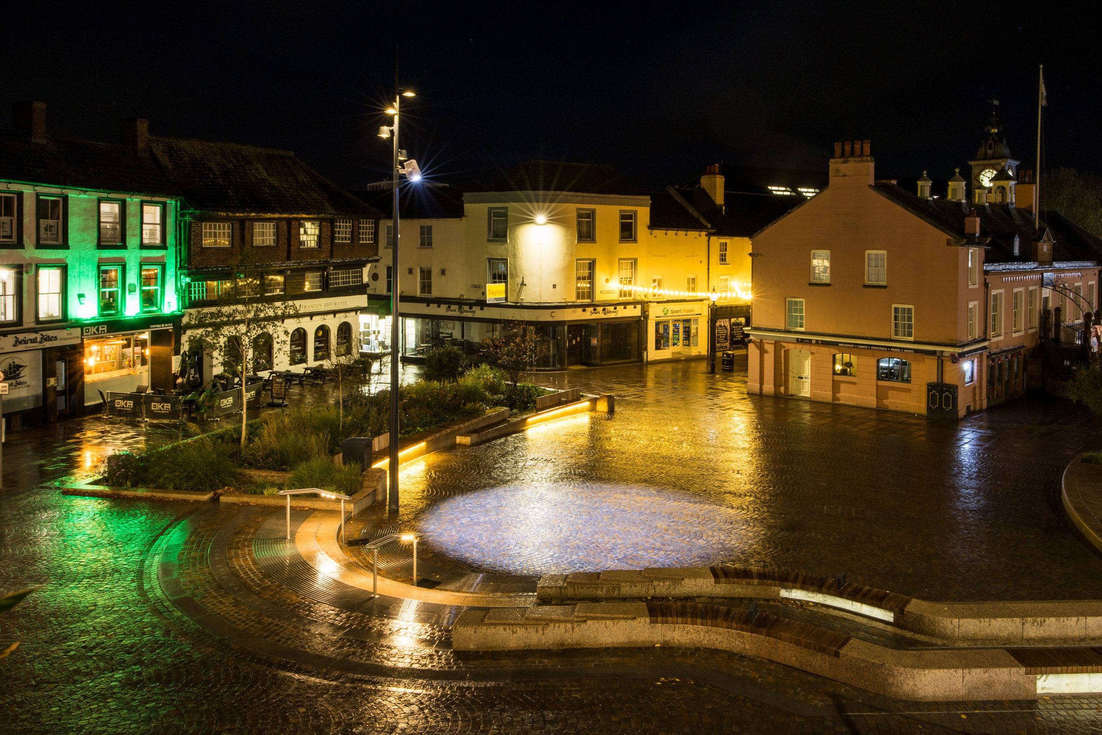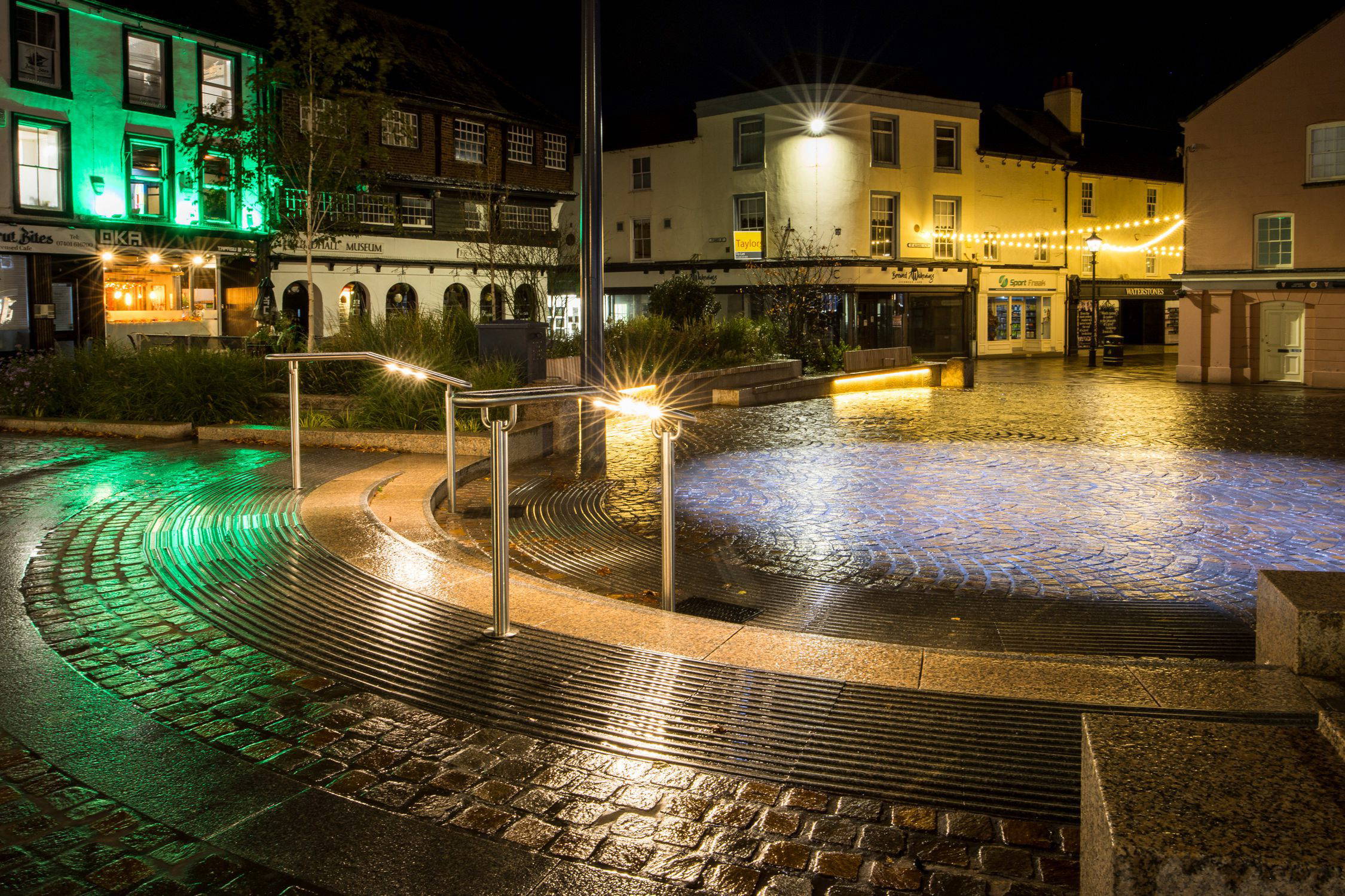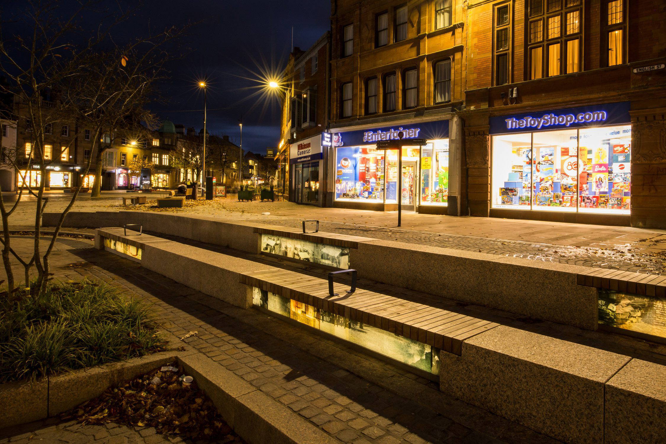 The western seat wall along the front of the Crown and Mitre hotel, incorporates an array of backlit glass panels designed by Natural Dimensions to exhibit images of the Greenmarket from previous centuries. ‘ To Market’, a collage of historic maps and photographs, artistically reinterpreted and arranged by Kirsty Brooks, was etched into the ten glass panels to tell the story of historic market trading, the guilds, weights, measures and the evolution of the site. The area is a gateway into the city’s Historic Quarter and provides an appropriate context for the beauty of Carlisle’s nationally recognized architecture. Backdropping the space is the grade 2 listed Crown and Mitre hotel, and the grade 1 listed Guildhall and Town hall. Most magnificent of all is the famous cathedral east window which is now revealed facing into the space and the Market Square beyond.