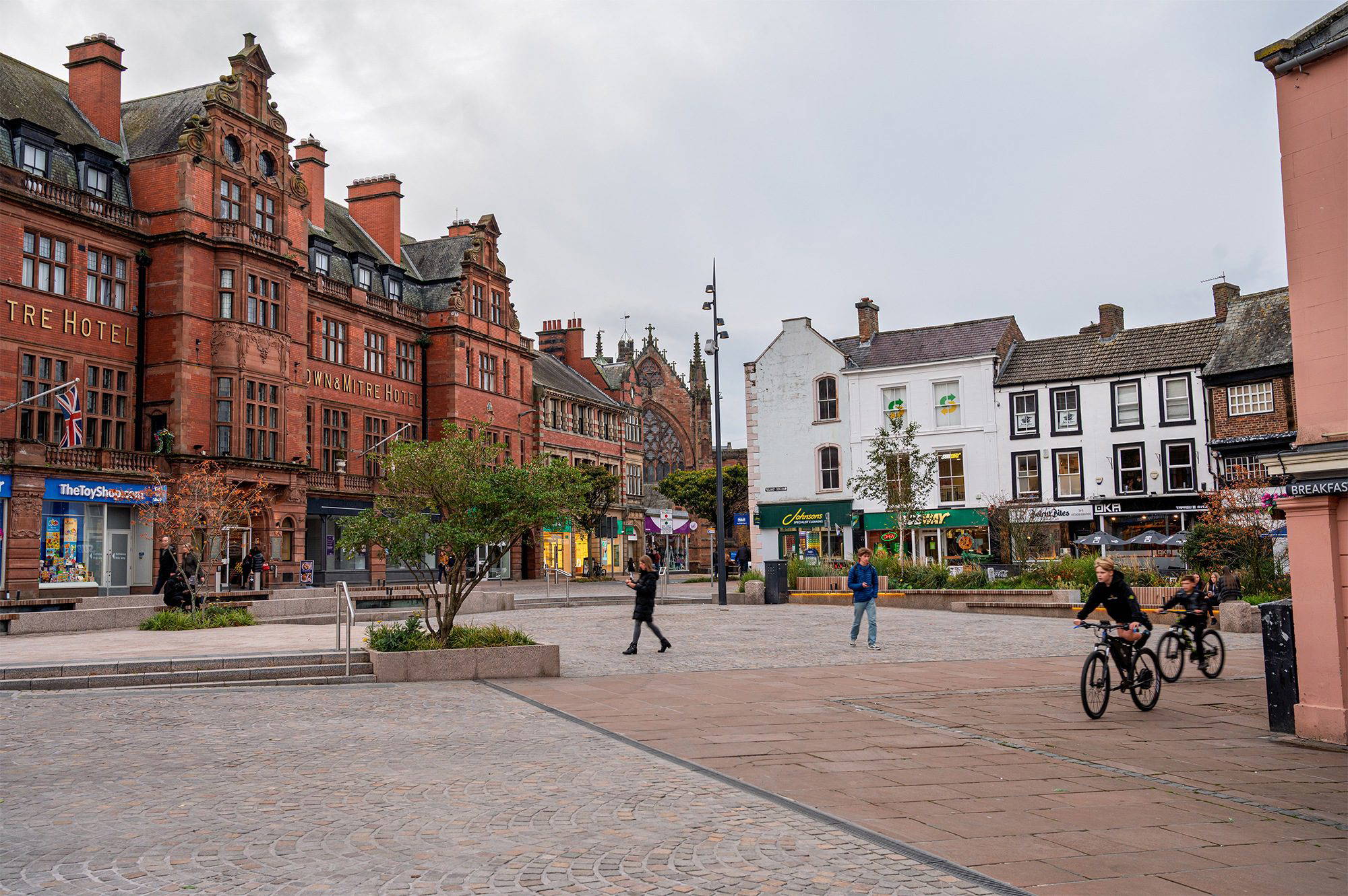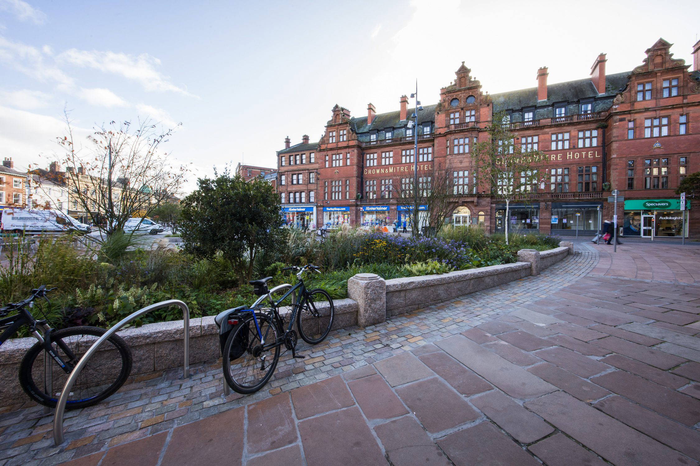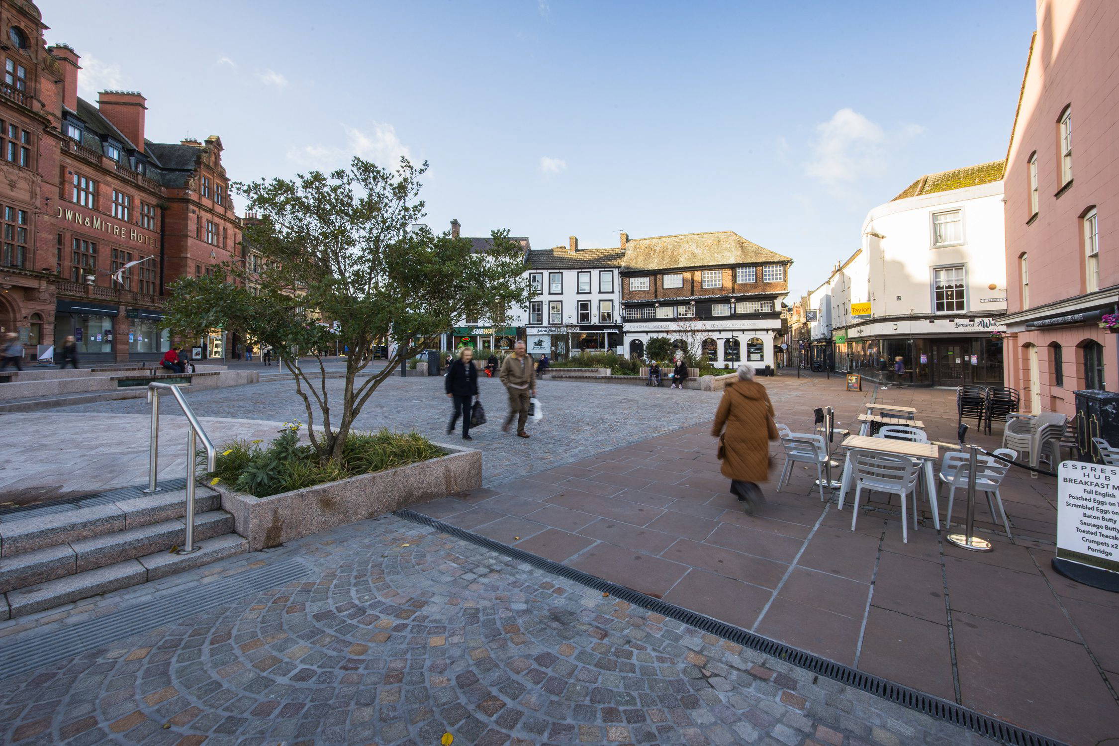 The western seat wall along the front of the Crown and Mitre hotel, incorporates an array of backlit glass panels designed by Natural Dimensions to exhibit images of the Greenmarket from previous centuries. ‘ To Market’, a collage of historic maps and photographs, artistically reinterpreted and arranged by Kirsty Brooks, was etched into the ten glass panels to tell the story of historic market trading, the guilds, weights, measures and the evolution of the site. The area is a gateway into the city’s Historic Quarter and provides an appropriate context for the beauty of Carlisle’s nationally recognized architecture. Backdropping the space is the grade 2 listed Crown and Mitre hotel, and the grade 1 listed Guildhall and Town hall. Most magnificent of all is the famous cathedral east window which is now revealed facing into the space and the Market Square beyond.