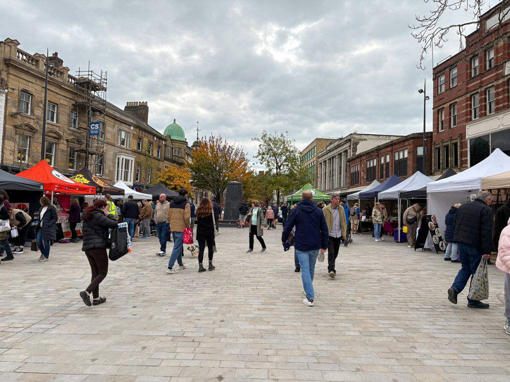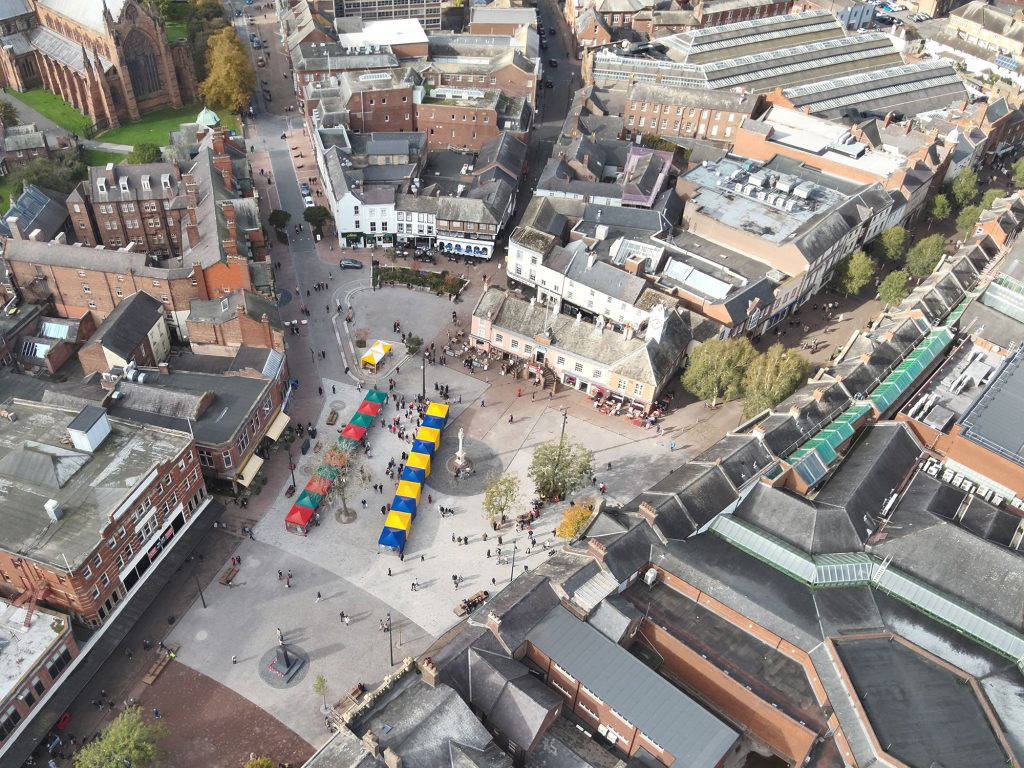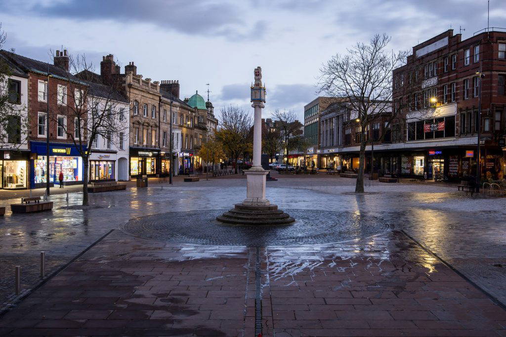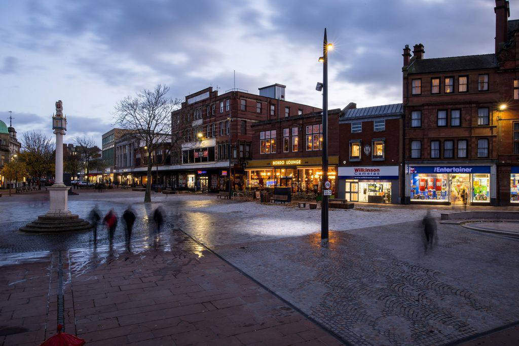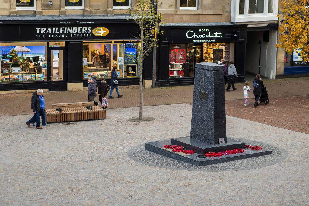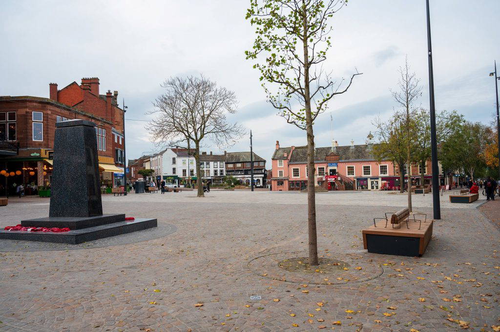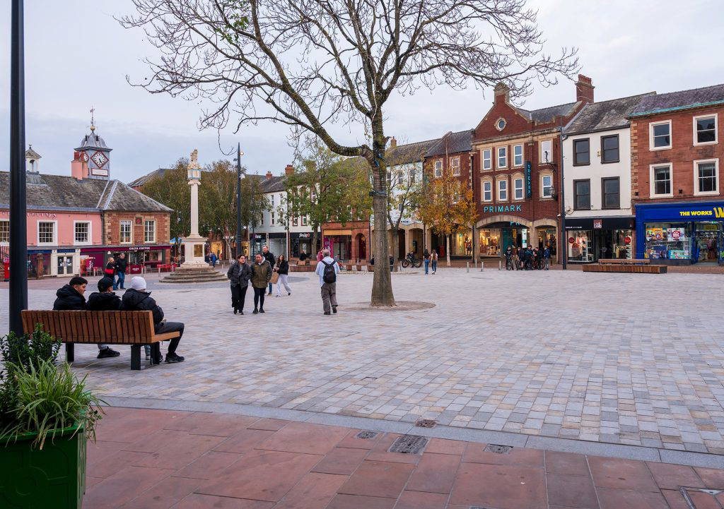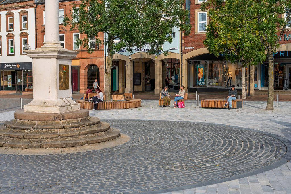 Extending our work in Carlisle southwards from the Greenmarket and Castle Street, the Market Square and the new war memorial area completes a 6000m2 civic regeneration scheme to inject new life into the public realm across the city centre and the main shopping area. The war memorial was relocated from a corner of the Greenmarket to a much more prominent position in alignment with the city’s historic Market Cross and town hall within the square. A new plinth was set under the original memorial in matching stone to house two Victoria Cross plaques in positions elevated up from their previous location within the pavement. A mix of granite and porphyry paving creates a characterful floorscape for the square and memorial area, with a market aesthetic commensurate with the historic shop elevations. Contemporary furniture has been introduced in sympathy with the architecture and additional tree planting in December 2025 will frame the war memorial and create a boulevard along the square’s western edge. New engraved paving around the Market Cross denotes the endpoint of the world famous Cumbria Way walking route.